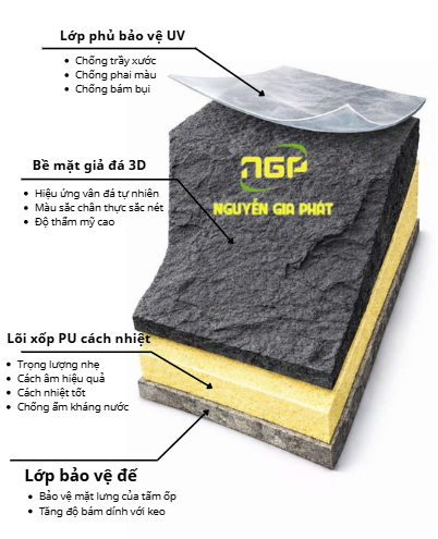 Sự kết hợp giữa lớp phủ UV – bề mặt giả đá 3D – lõi PU cách nhiệt – lớp đế bảo vệ giúp tấm ốp: