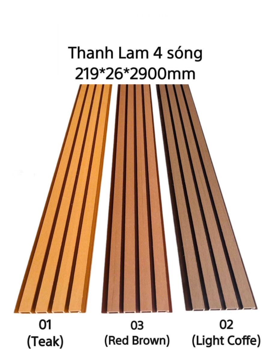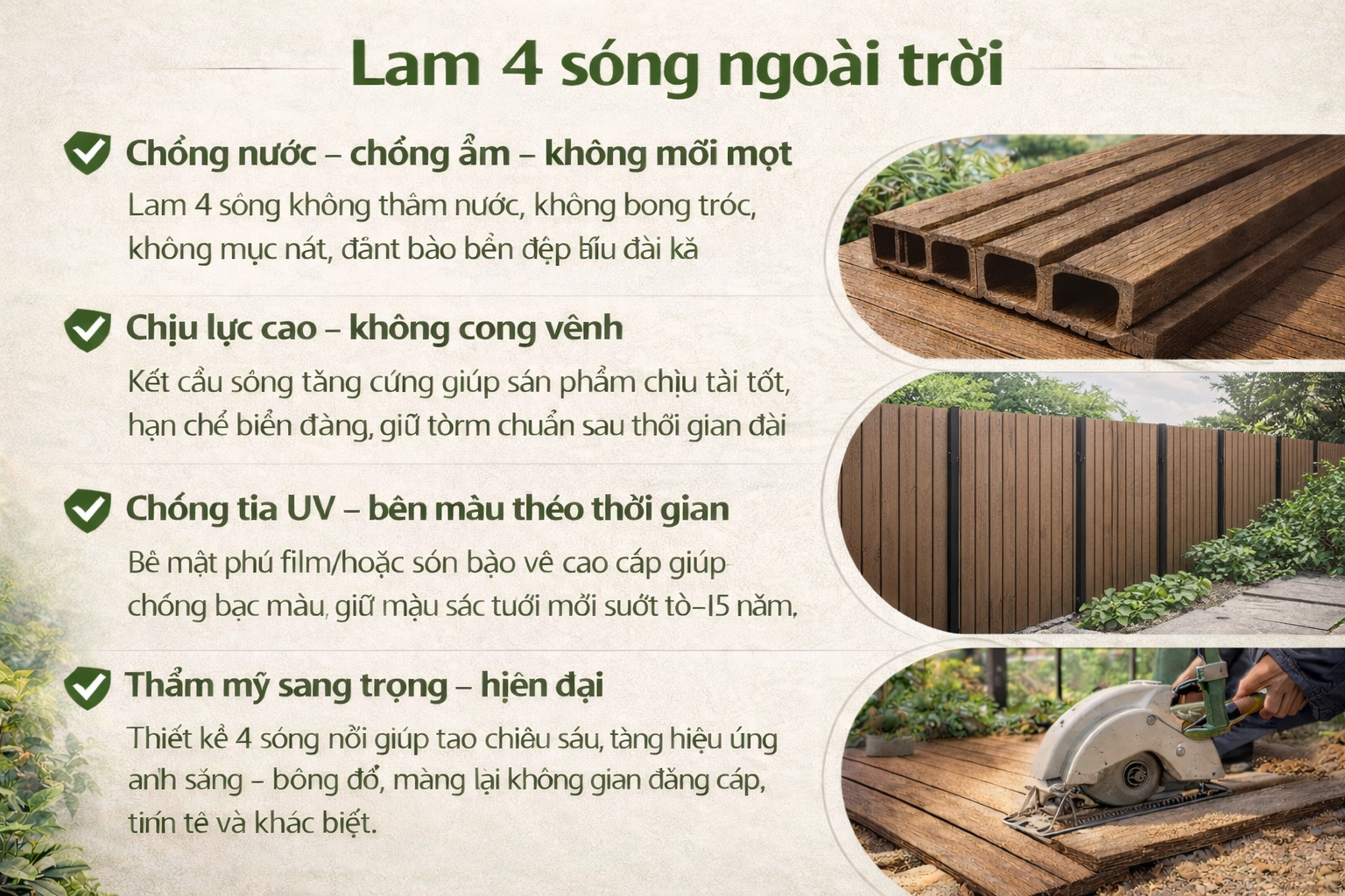 Lam 4 sóng ngoài trời là dòng vật liệu trang trí kiến trúc cao cấp, được thiết kế dạng thanh lam có 4 gờ sóng nổi, giúp tăng độ cứng chắc, chịu lực tốt và tạo hiệu ứng thẩm mỹ sang trọng, hiện đại.