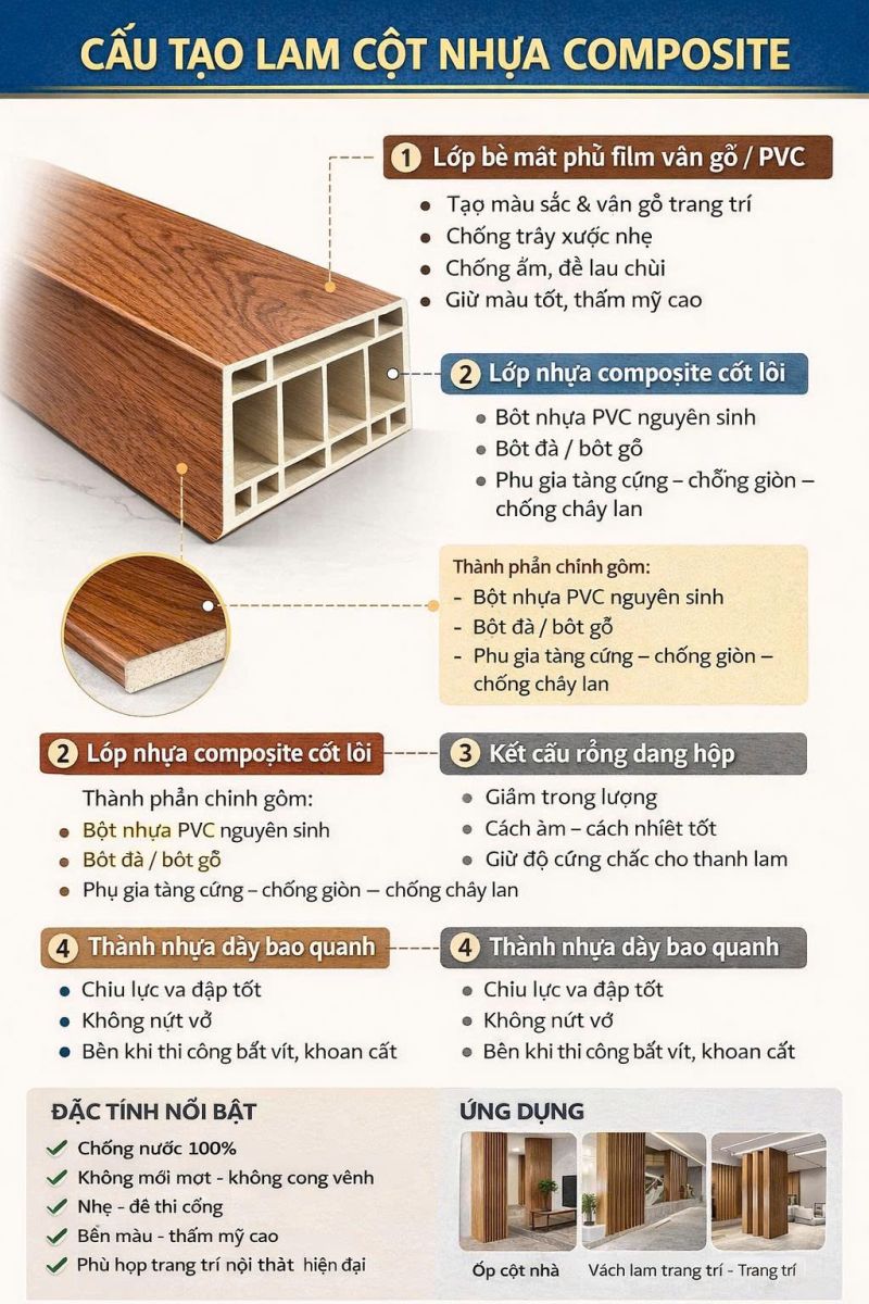 Bề mặt lam cột thường được thiết kế vân gỗ hoặc màu sắc hiện đại, tạo cảm giác giống gỗ thật và tăng tính thẩm mỹ cho công trình.