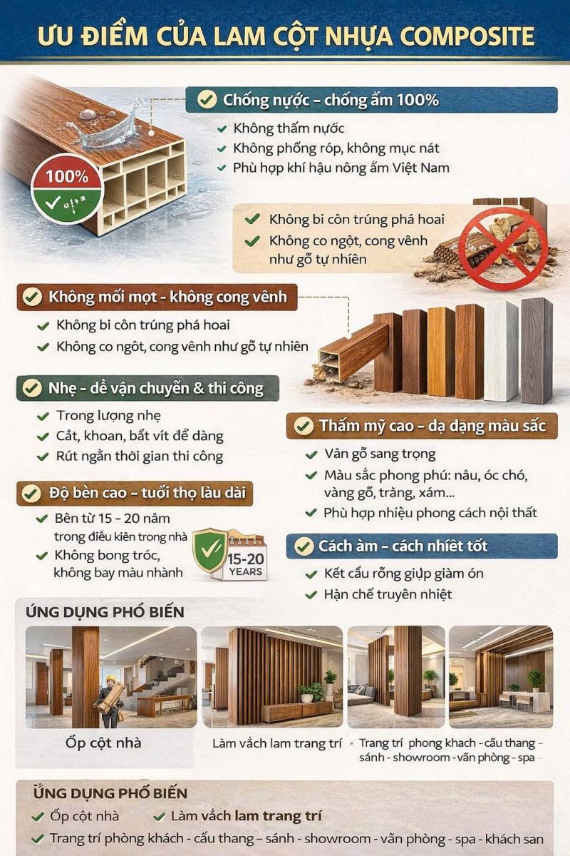 Lam cột thường được sản xuất từ các vật liệu tổng hợp cao cấp giúp tăng độ bền và khả năng chịu lực.