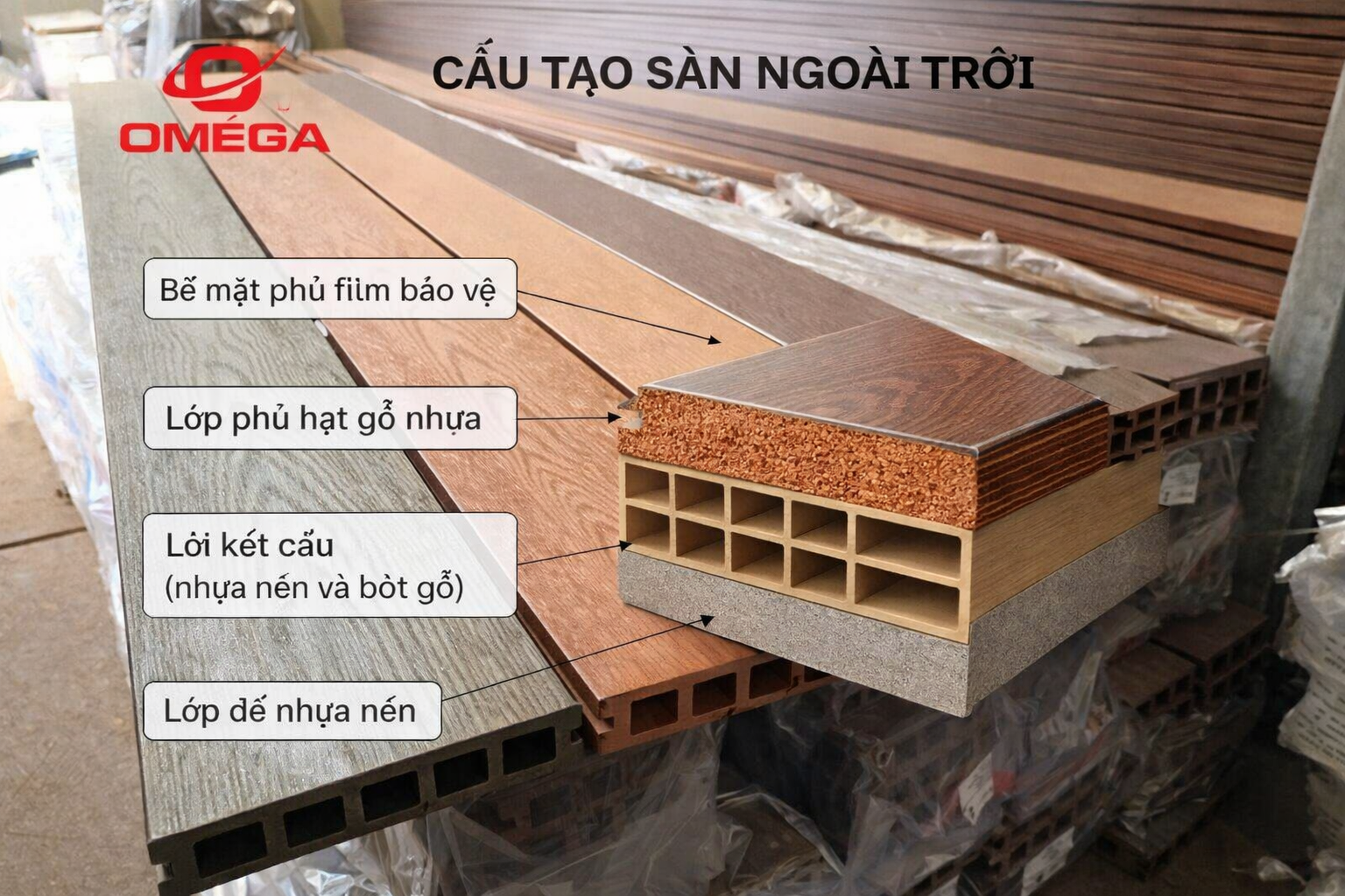 Sàn nhựa ngoài trời thường được cấu tạo từ các lớp vật liệu đặc biệt giúp tăng độ bền và khả năng chống chịu thời tiết.