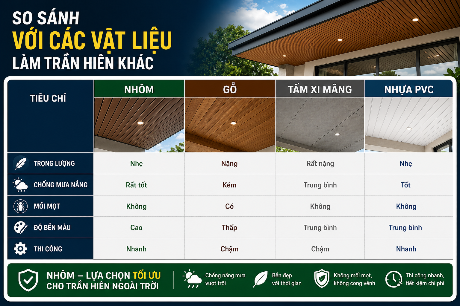 | Tiêu chí | Nhôm | Gỗ | Tấm xi măng | Nhựa PVC |
