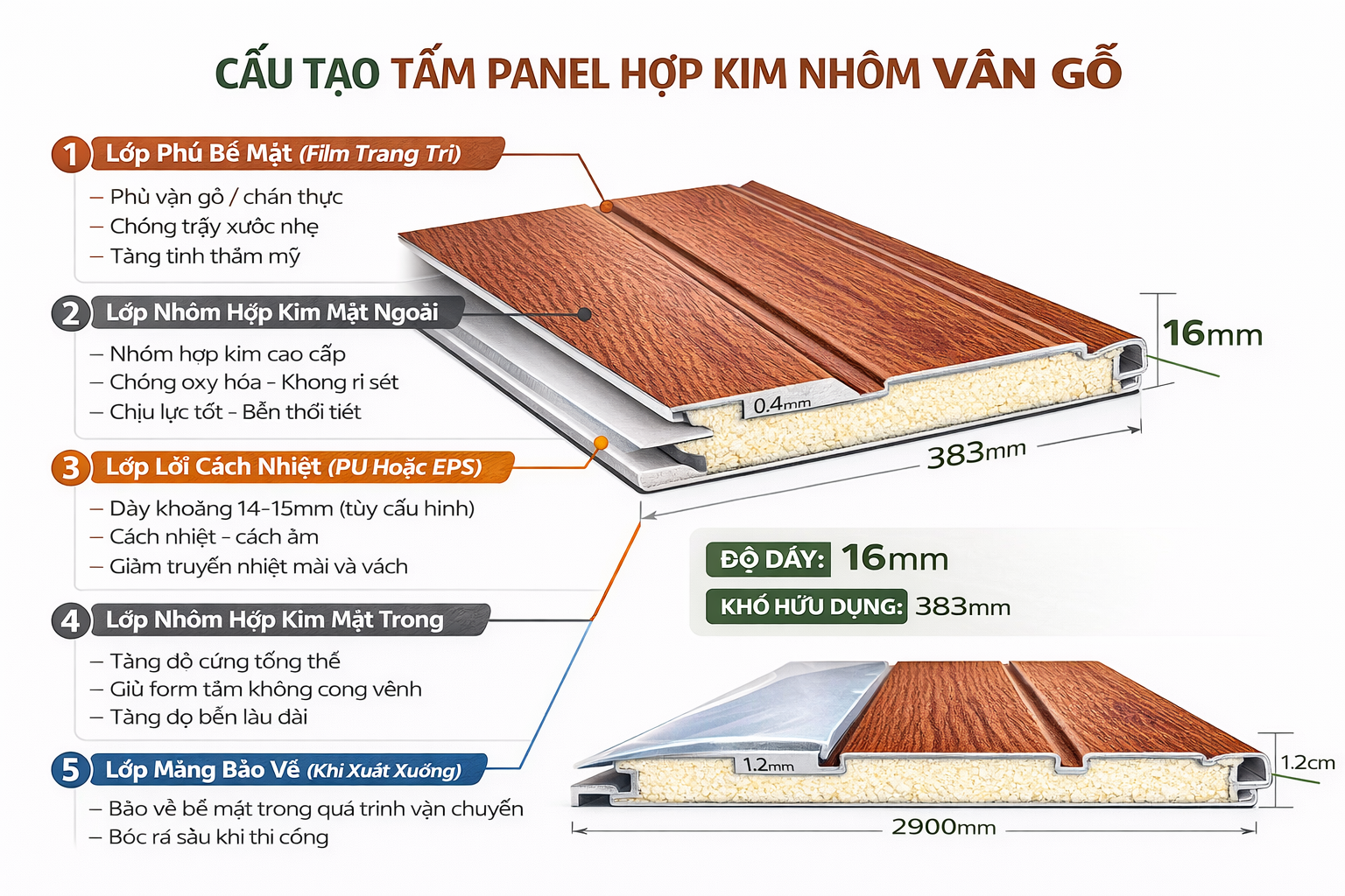 Một tấm panel hợp kim nhôm tiêu chuẩn thường gồm: