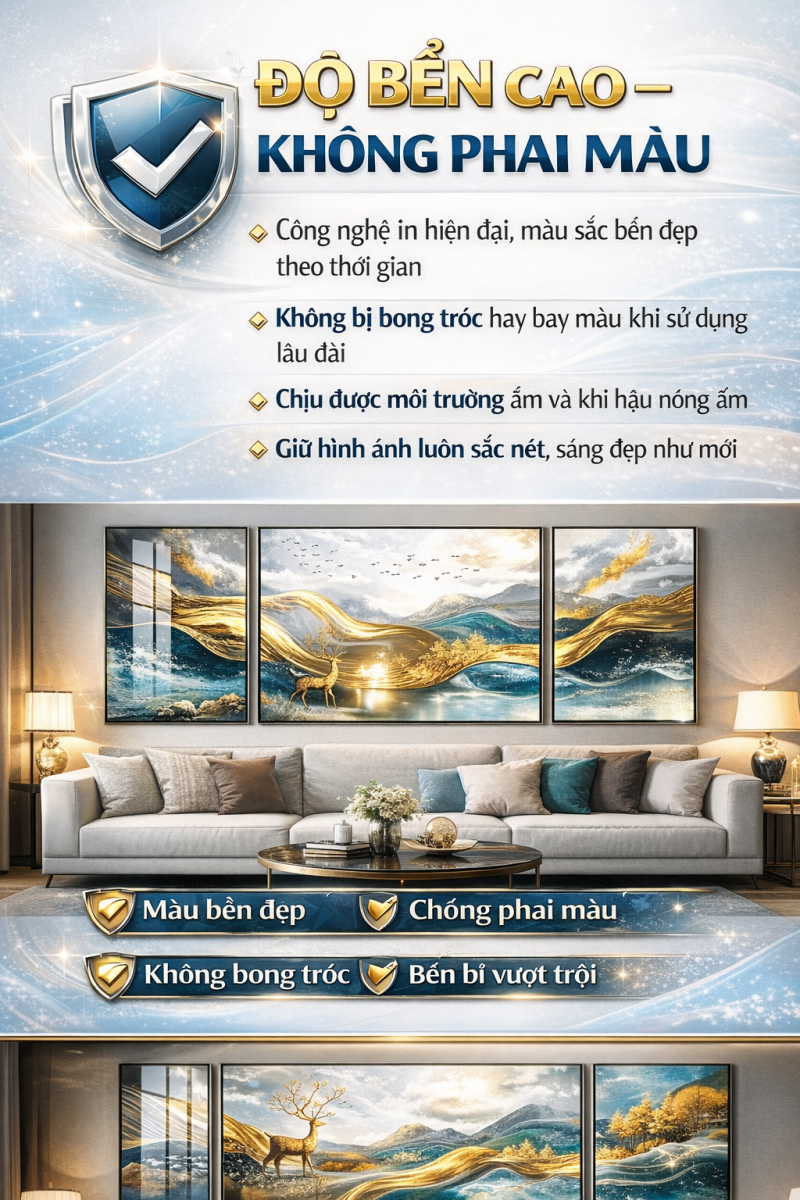 Nhờ lớp phủ đặc biệt này, tranh có độ bền cao, chống trầy xước và chống ẩm tốt, giúp giữ được vẻ đẹp lâu dài theo thời gian.